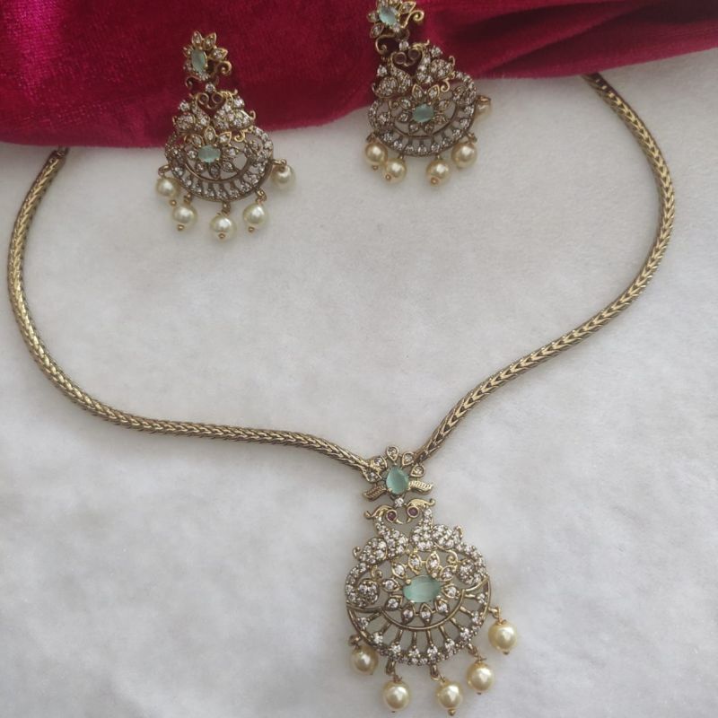 Elegant antique gold finish American diamond necklace set featuring mint green stones and pearl drops, paired with matching traditional earrings.