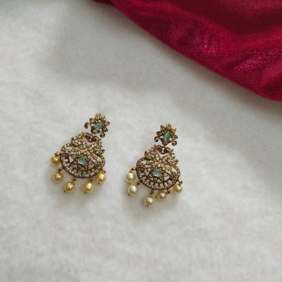 Antique Gold Finish American Diamond Necklace Set with Mint Stone & Pearl Drops