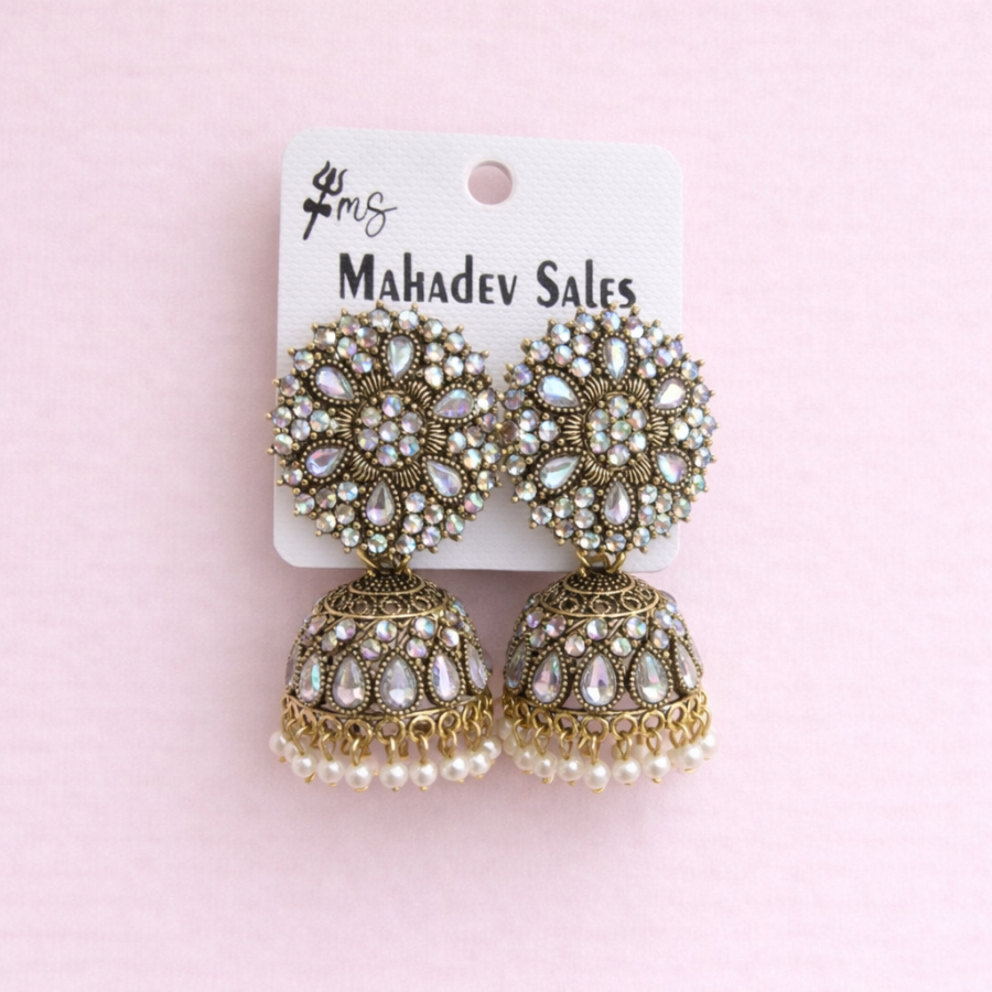 Antique Gold Plated AD Stone Bridal Jhumka Earrings with Pearl Drops