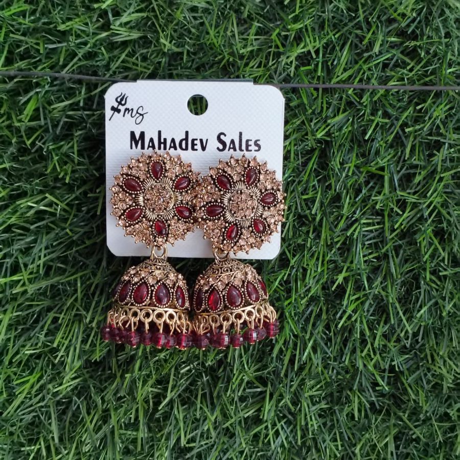 The dome-shaped jhumka is decorated with teardrop maroon stones and detailed gold patterns that reflect classic Indian craftsmanship. The bottom is finished with matching maroon bead hangings, adding graceful movement and charm to the earrings.