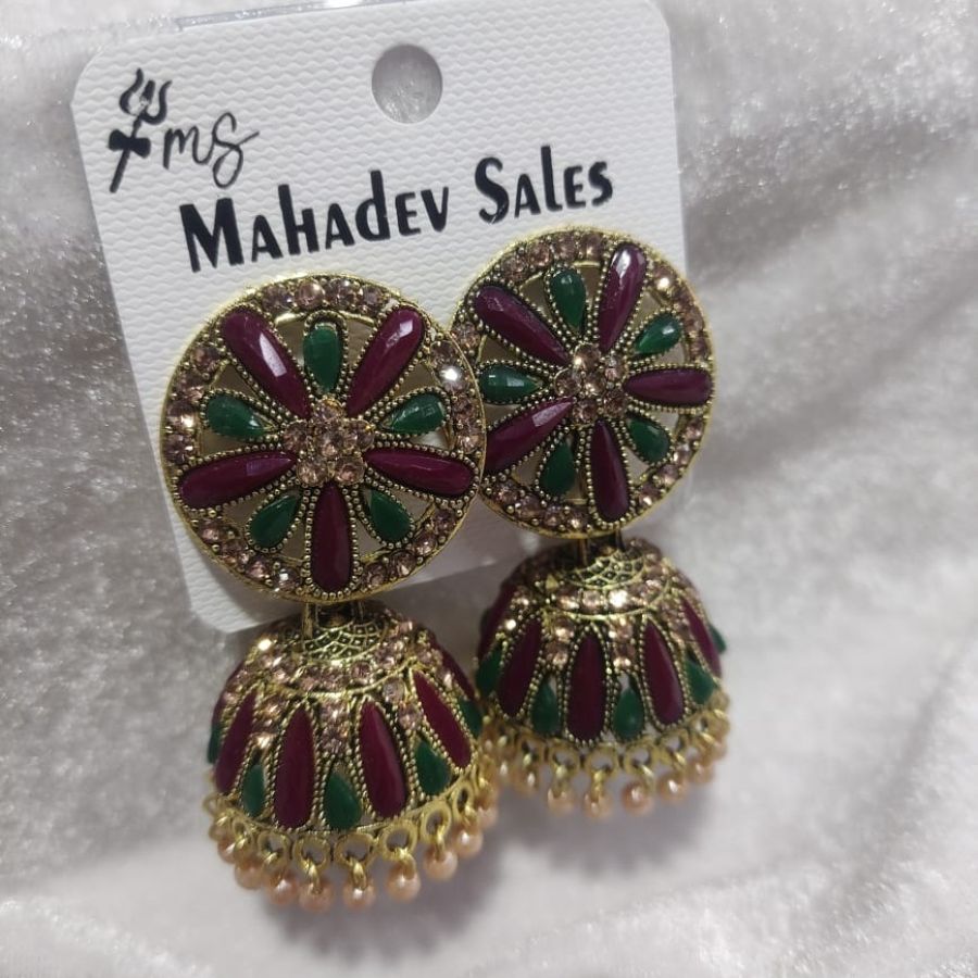 Traditional antique-finish jhumka earrings featuring maroon and green stone detailing with elegant pearl drops, perfect for festive and ethnic wear.