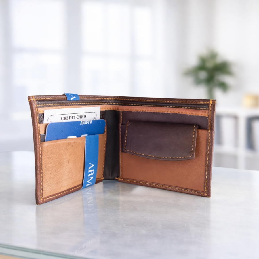 Premium brown leather bi-fold wallet with embossed Armani logo and contrast yellow stitching. Stylish, durable and perfect for everyday use.