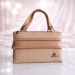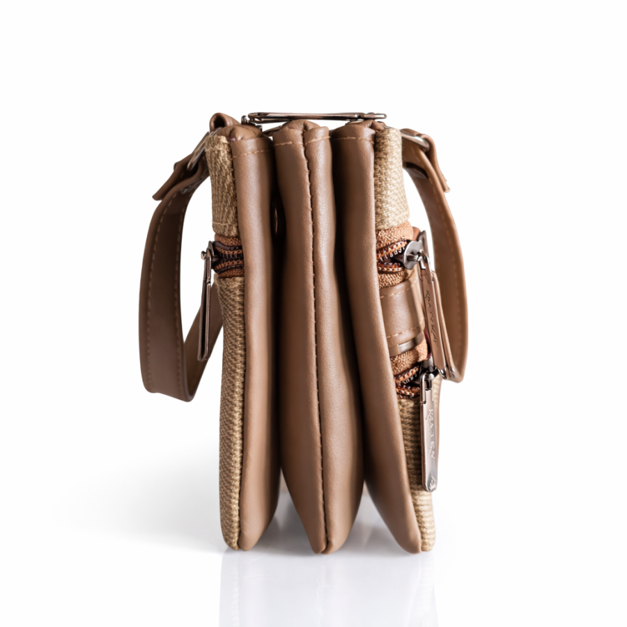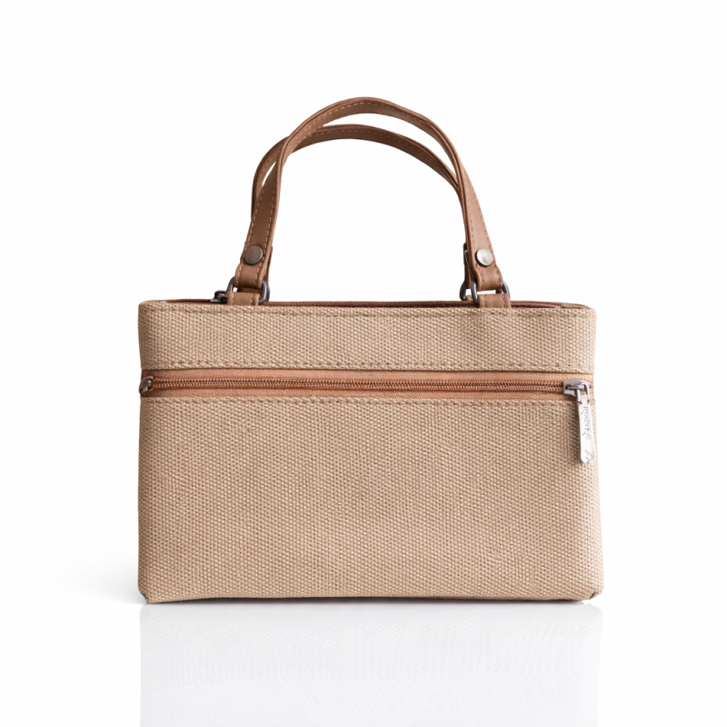 A classy beige textured handbag featuring multiple front zipper compartments and sturdy top handles. Stylish, compact, and functional — perfect for daily use and outings.