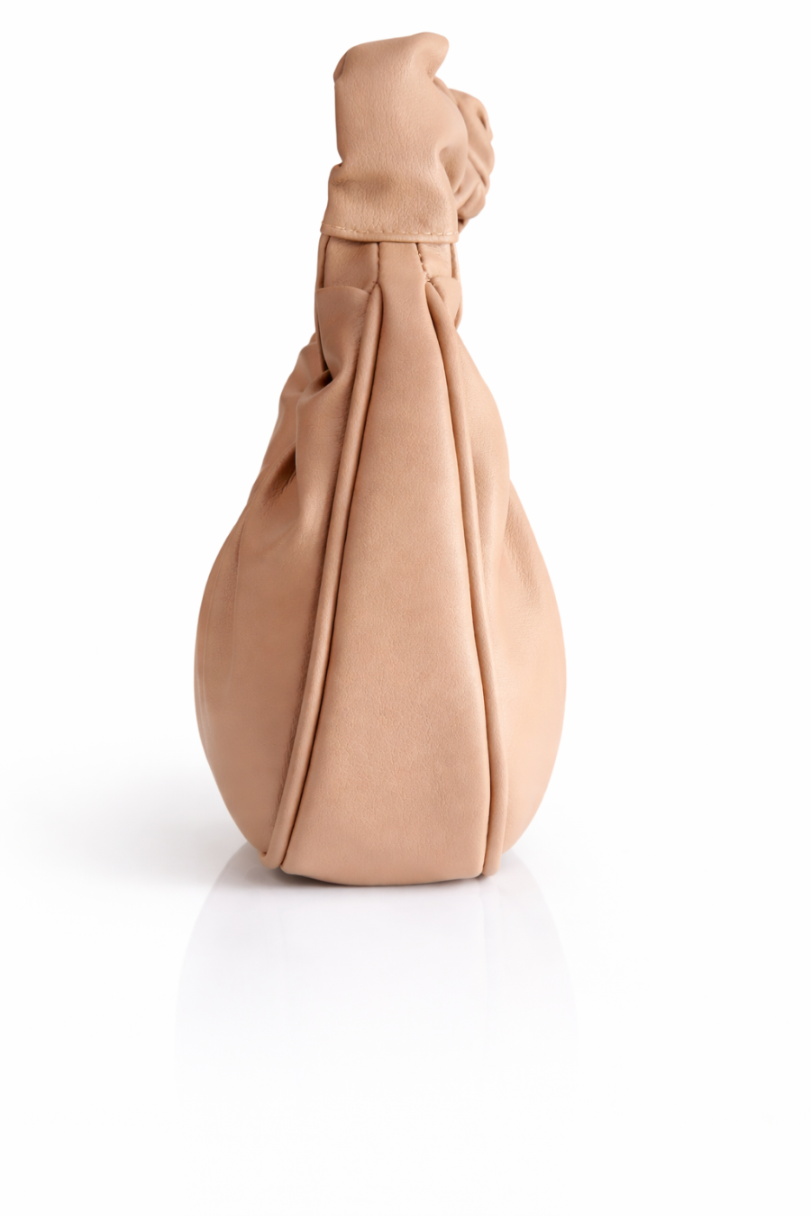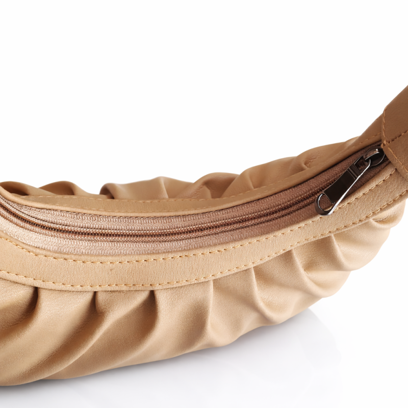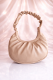 A stylish beige crescent-shaped shoulder bag featuring a soft ruched handle and elegant minimalist design. Perfect for parties, brunch, and everyday chic looks.