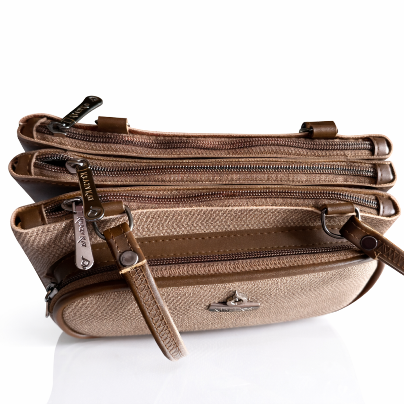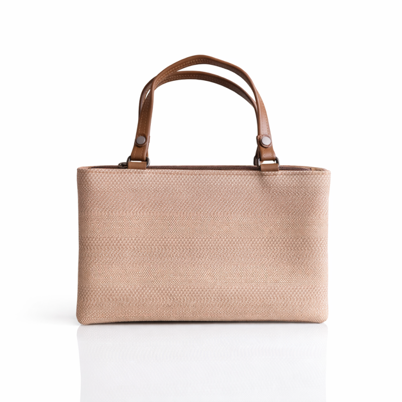 A stylish beige textured handbag with a structured design and sturdy top handles. Featuring a front zip pocket and premium finish, this bag is perfect for daily use and special occasions.