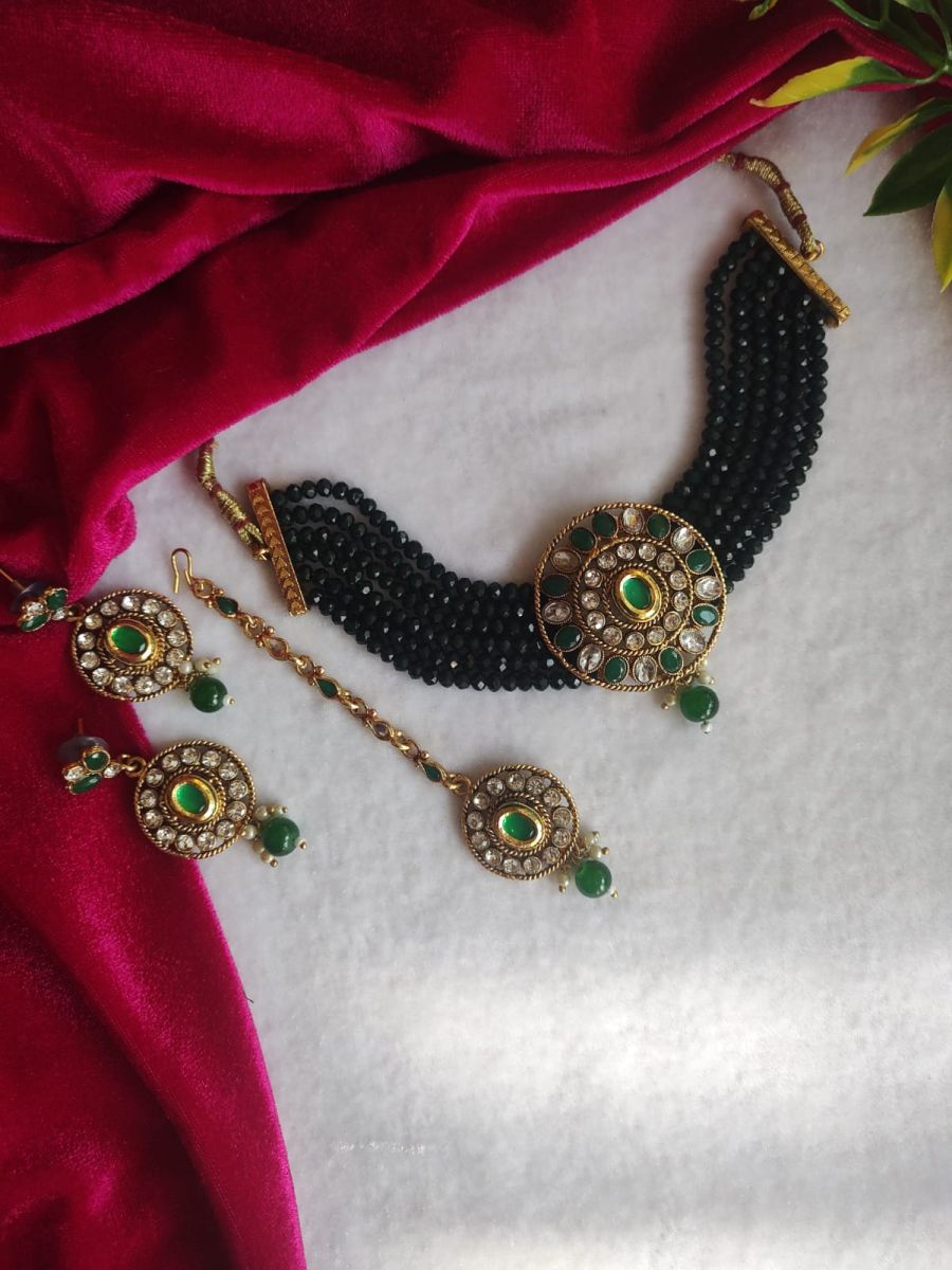 Black Beads Green Kundan Party Wear Choker Necklace Set with Earrings & Maang Tikka