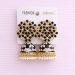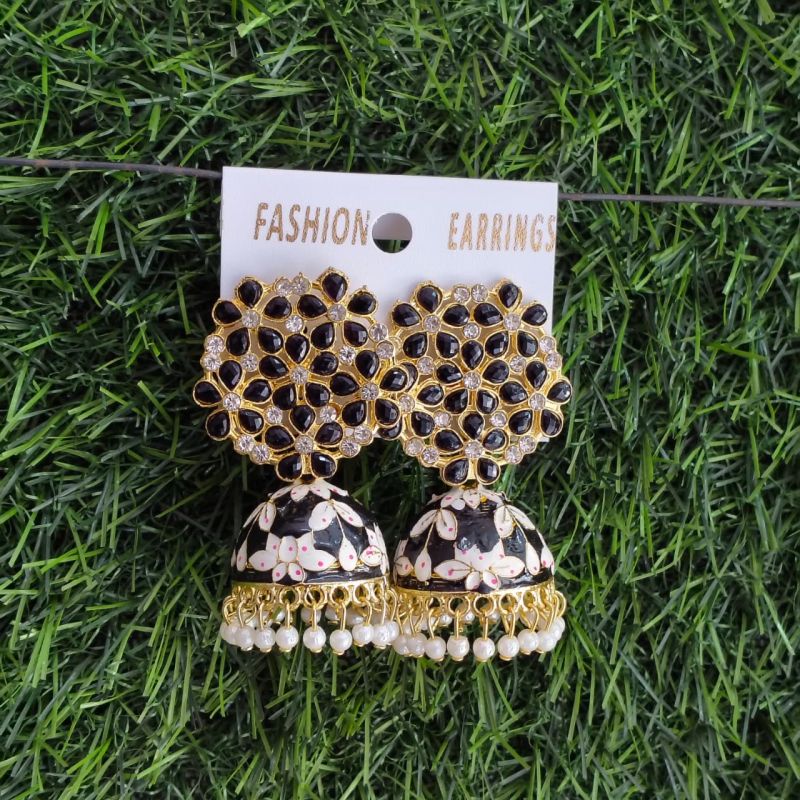 Elegant black and gold floral jhumka earrings featuring crystal-studded tops and pearl drop detailing, perfect for festive and party wear.