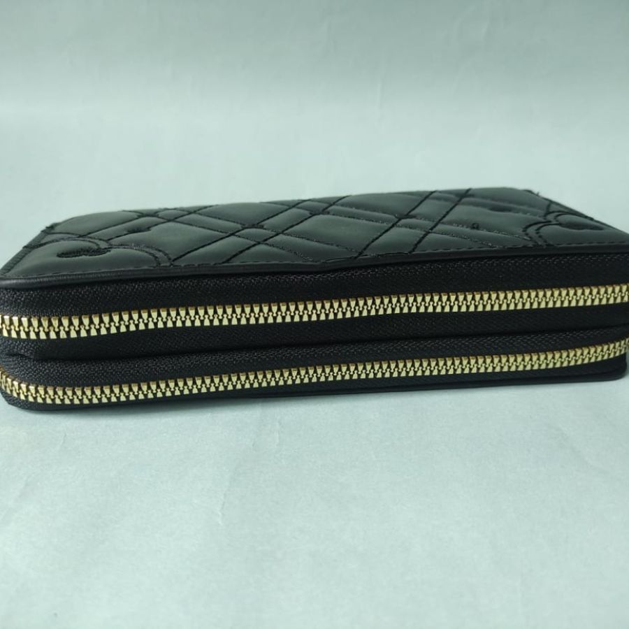 Elegant black quilted long wallet with heart-stitched detailing and secure zip closure, perfect for daily use and party wear.