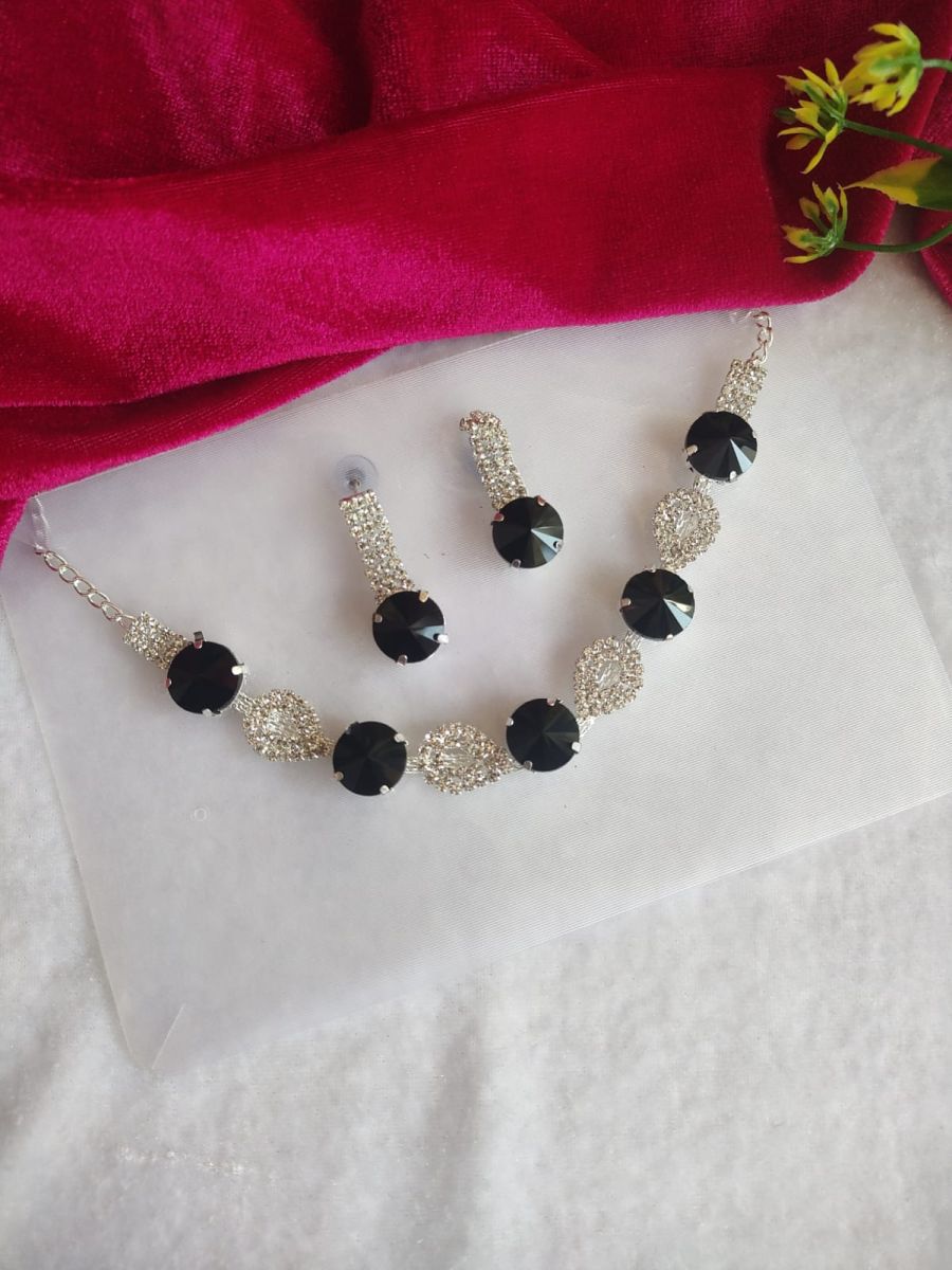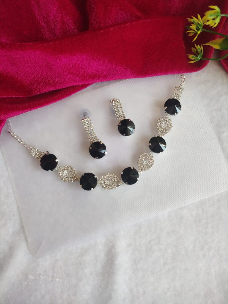 Black Stone Diamond Crystal Party Wear Necklace Set with Earrings