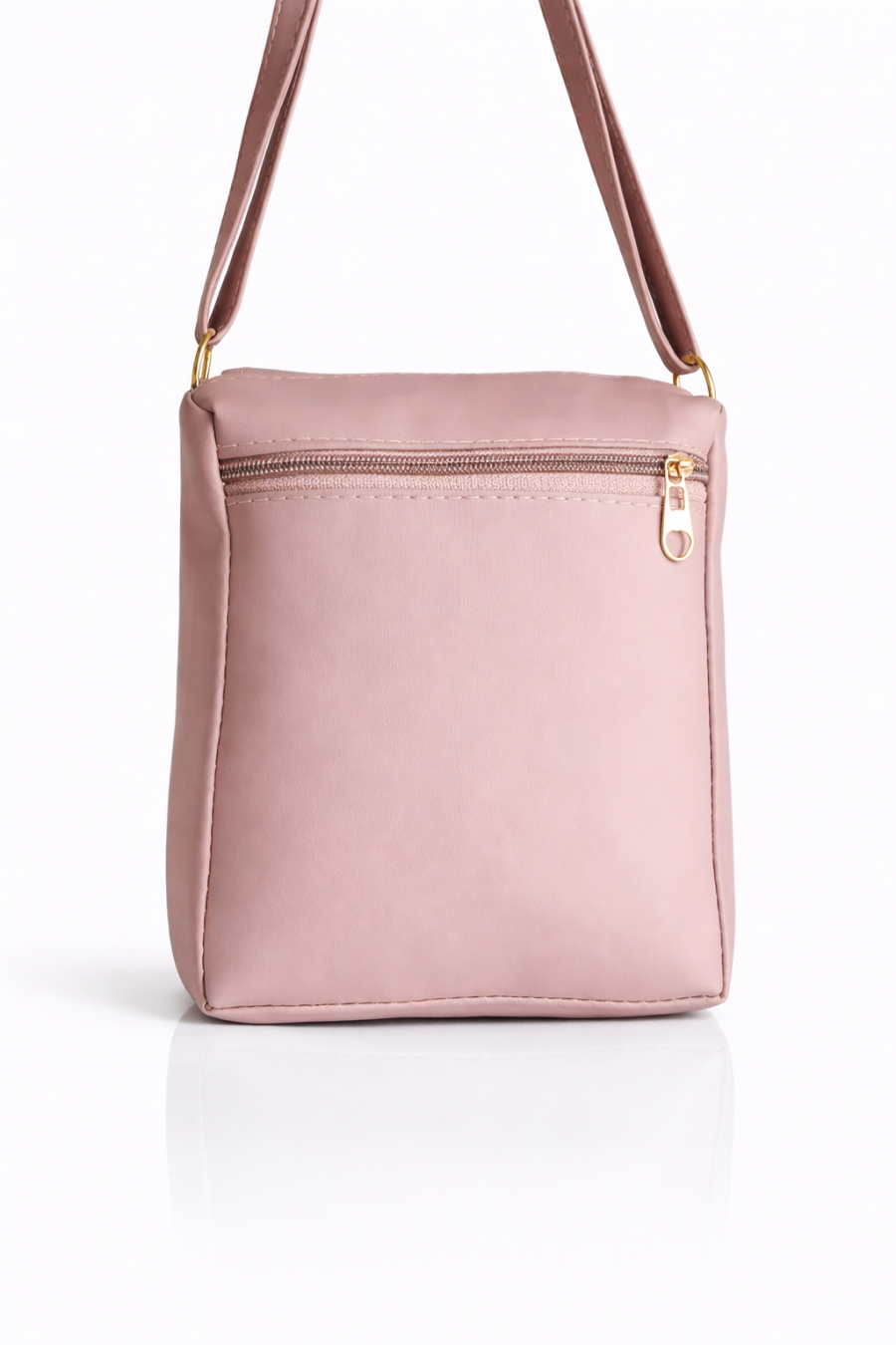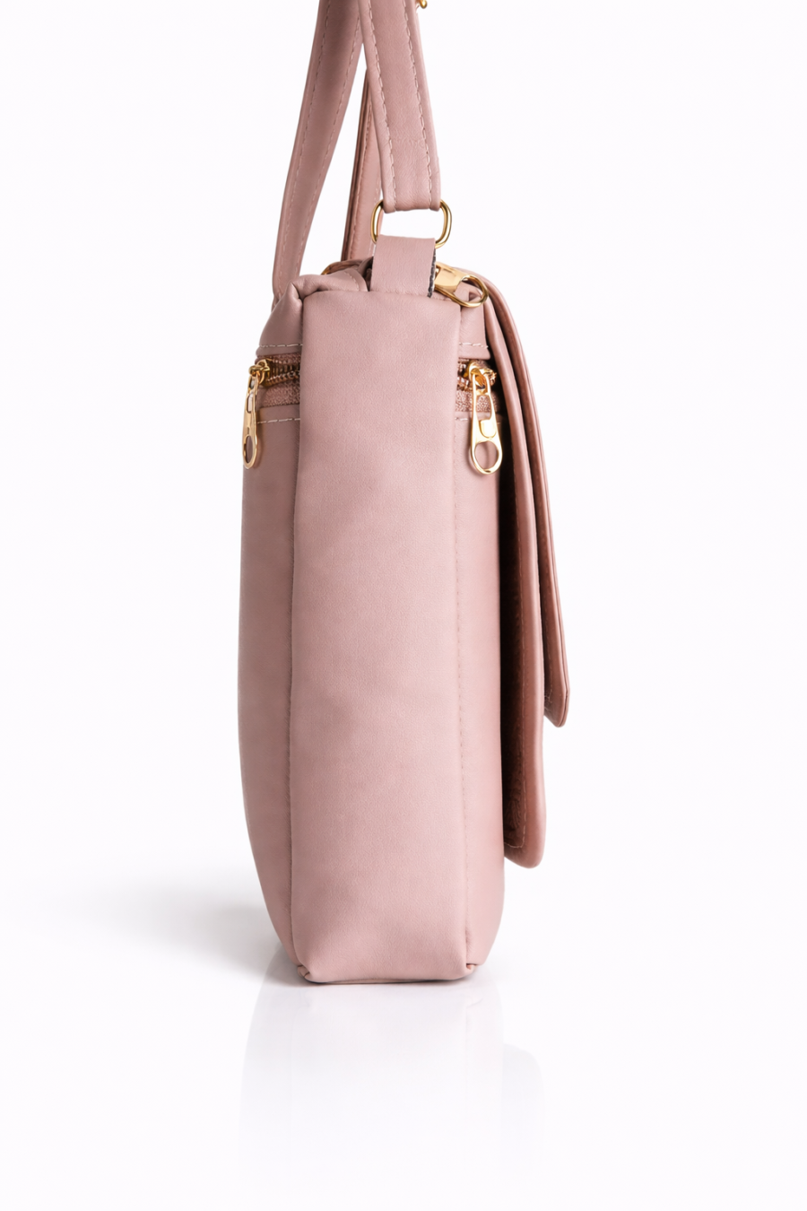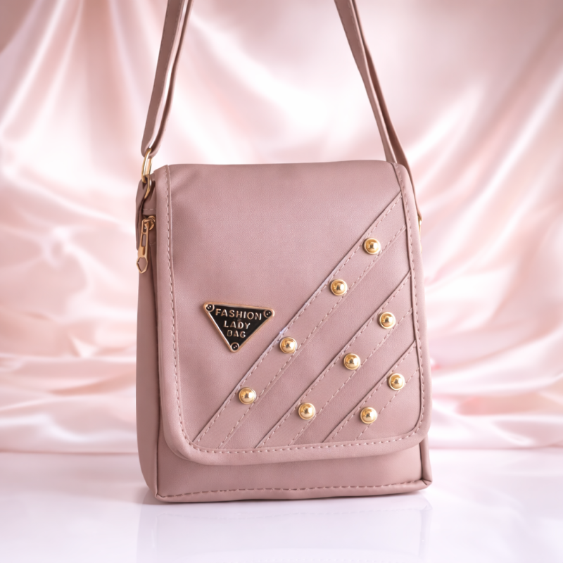 A stylish blush pink mini sling bag featuring gold stud detailing and a sleek flap design. Compact, trendy, and perfect for daily outings or parties.