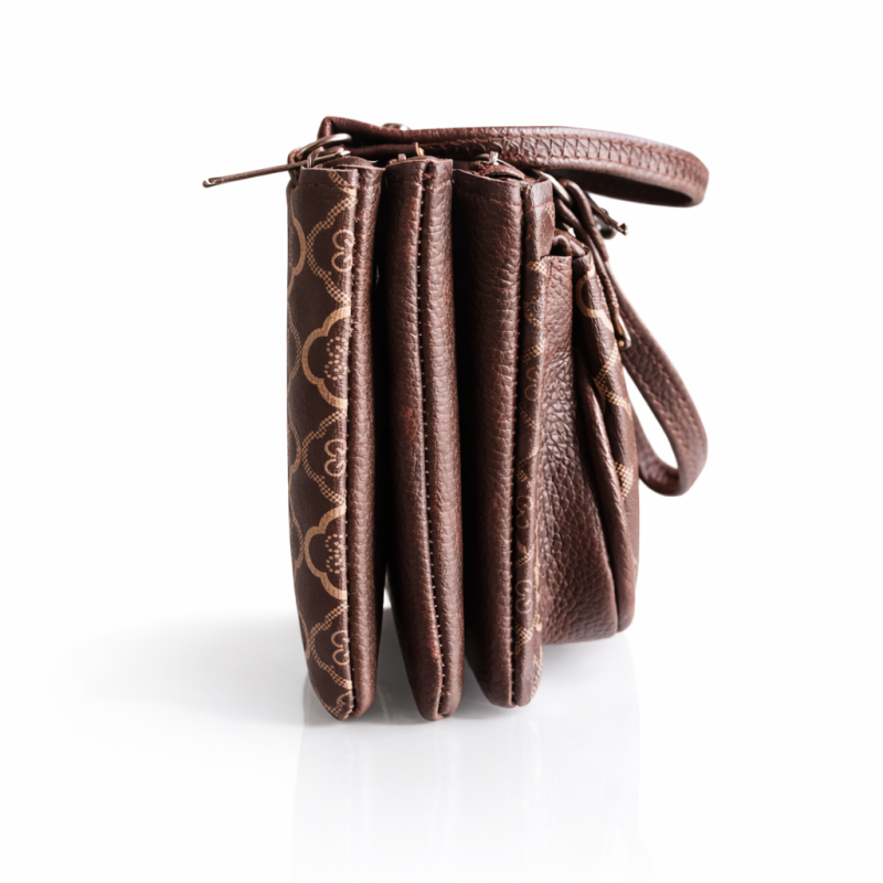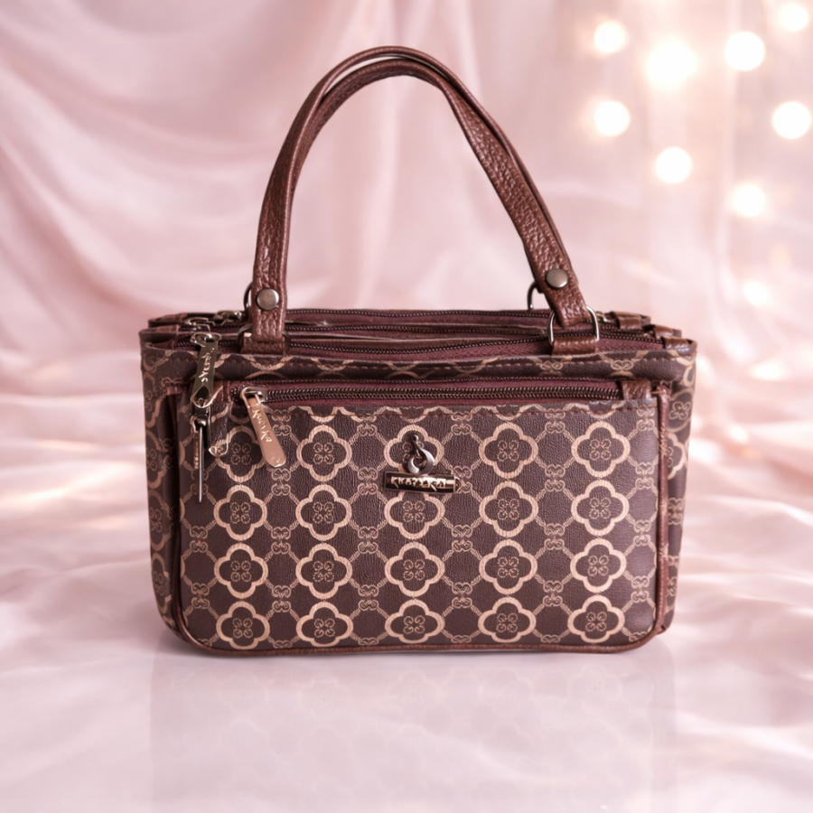 Brown Floral Printed Multi-Compartment Handbag for Women