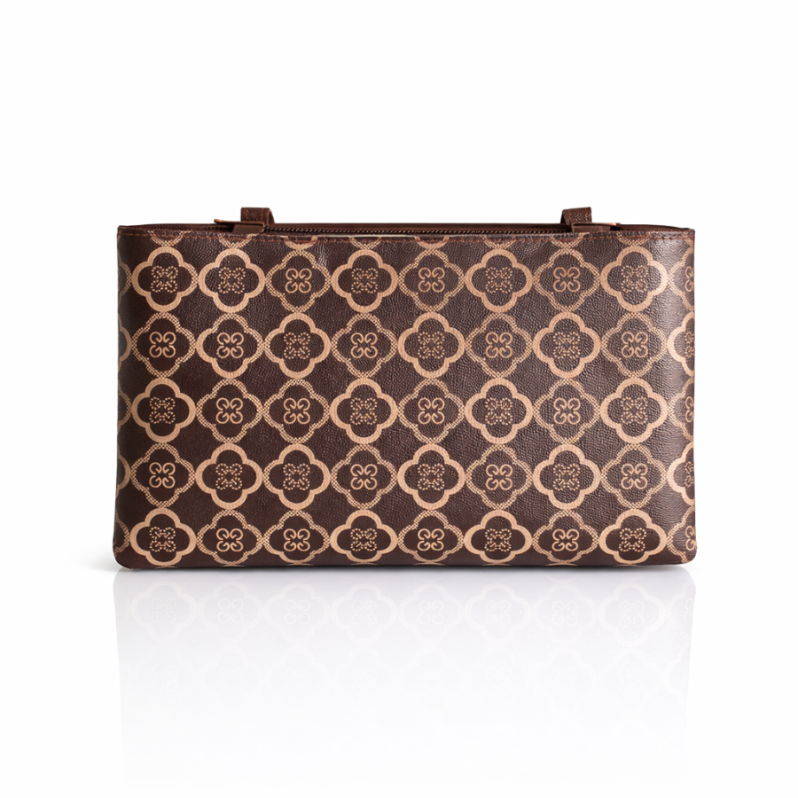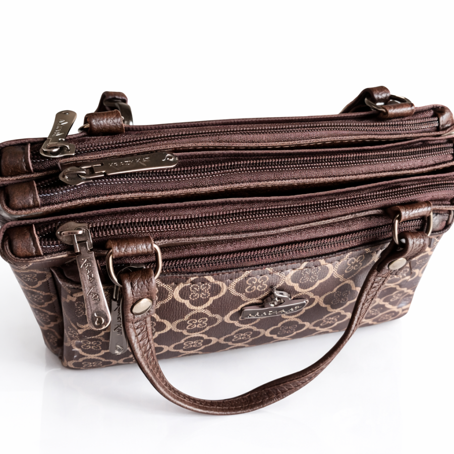 Elegant brown floral printed handbag with multiple zip compartments and sturdy dual handles. Perfect for office, travel, shopping and daily use.