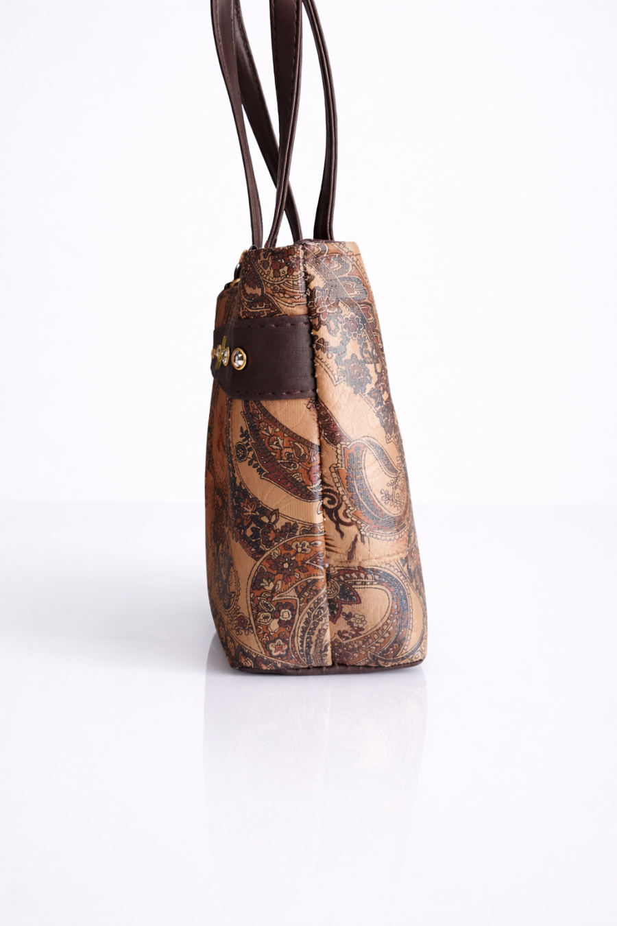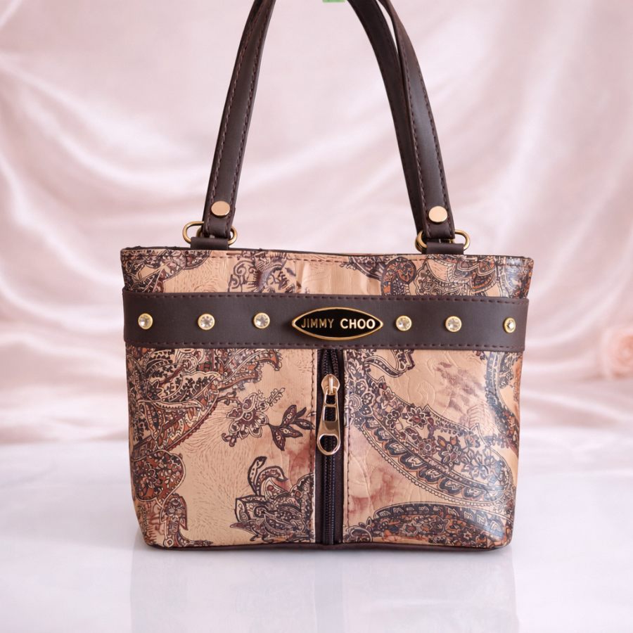 A stylish brown paisley print shoulder handbag with elegant stud detailing and front zipper pocket. Perfect for daily use, shopping, and casual outings.