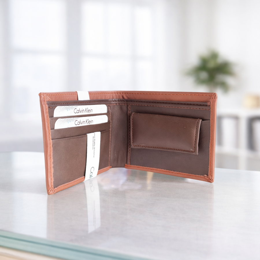 Stylish tan leather bi-fold wallet featuring Calvin Klein branding. Compact, lightweight and perfect for daily use with a premium and modern finish.