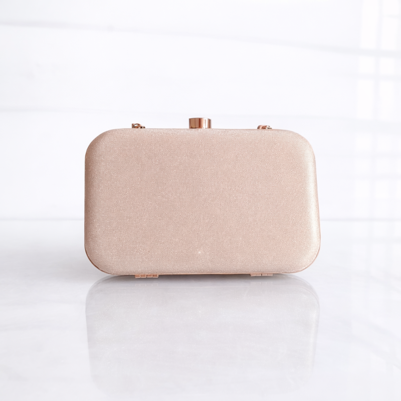 A premium champagne gold glitter box clutch featuring a sleek hard case design and detachable golden chain strap. Perfect for weddings, parties, and festive occasions to add sparkle and elegance to your look.