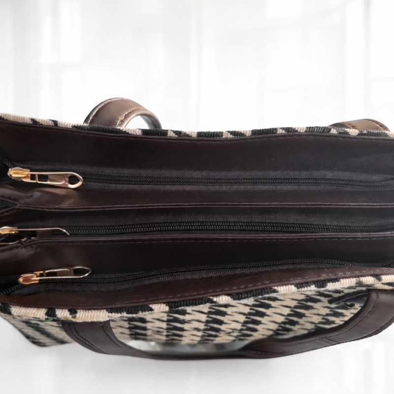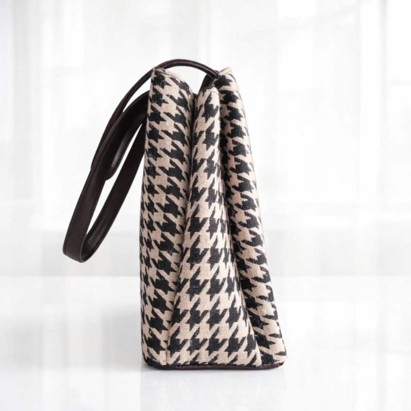 Elegant black and beige houndstooth print tote handbag with sturdy brown handles. Perfect for office, shopping, and daily use.