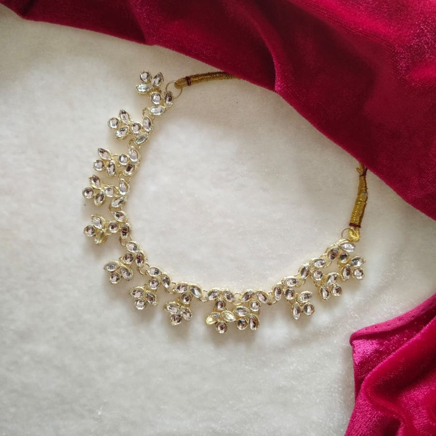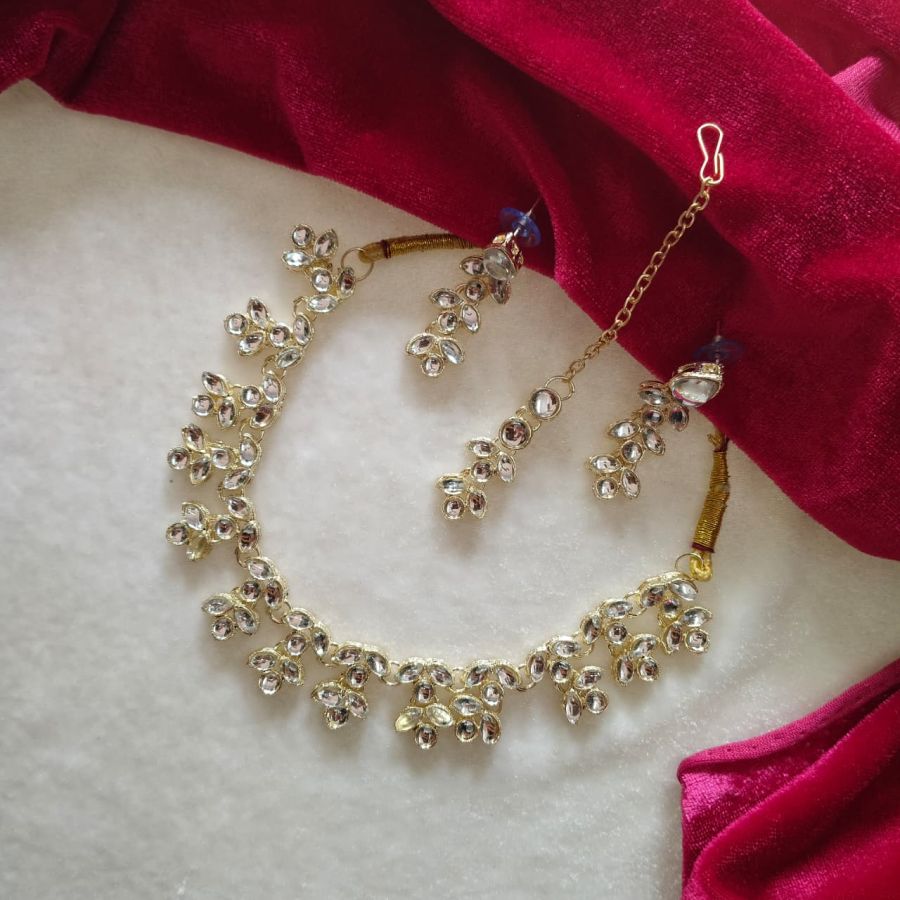 A stunning crystal floral party wear choker set with sparkling kundan stones and matching earrings, perfect for weddings, parties, and festive occasions.