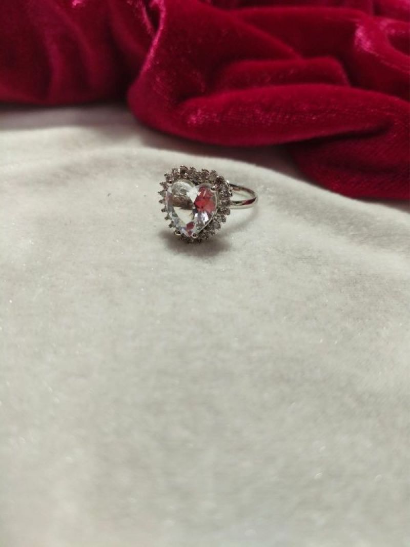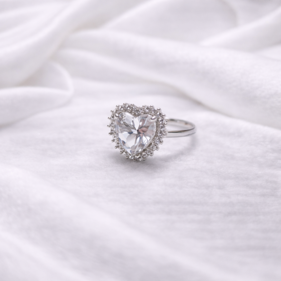 Elegant silver plated ring featuring a sparkling heart-shaped crystal surrounded by a shimmering halo of stones. Perfect for parties, gifting, and special occasions.