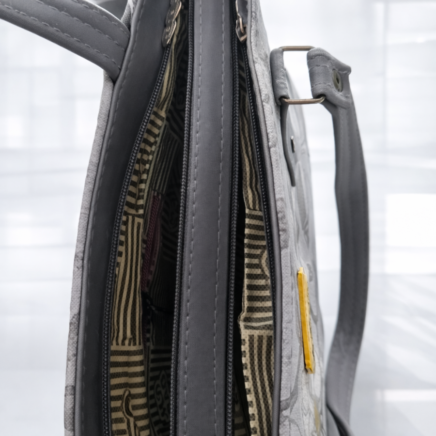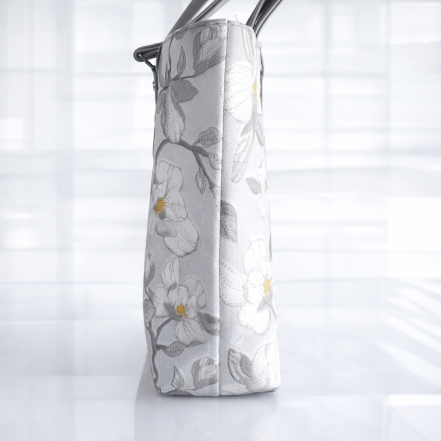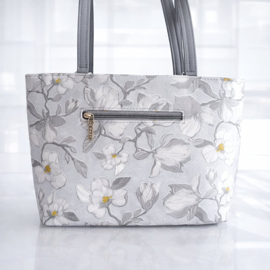 Stylish grey floral tote handbag with sturdy shoulder handles and spacious interior. Perfect for office, shopping, college and daily use.