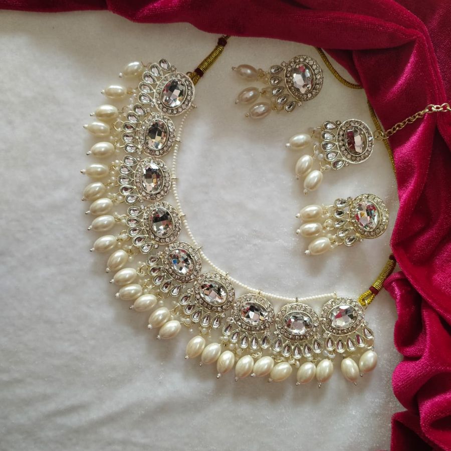 Elegant Mirror Stone Pearl Drop Party Wear Choker Set