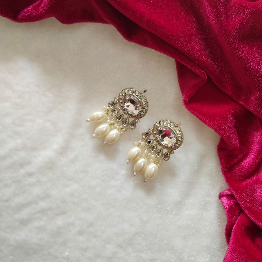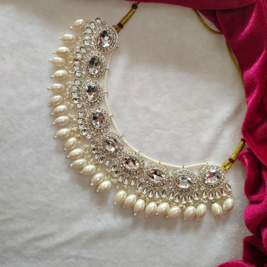 A stunning party wear choker set featuring sparkling mirror stones with beautiful pearl drop detailing, perfect for weddings, festive occasions, and special events.