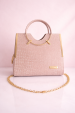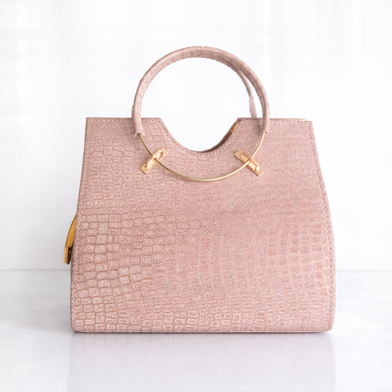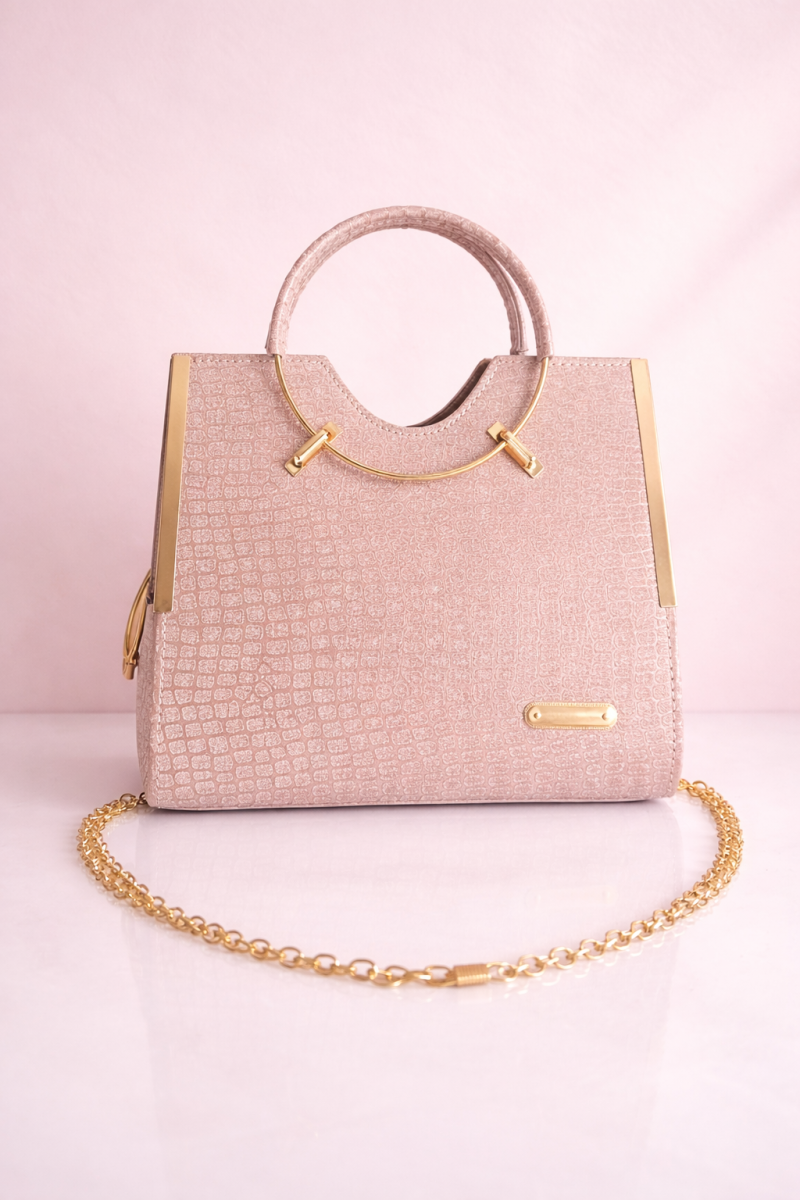 A premium pink textured handbag featuring a croc-pattern finish, stylish round top handle, gold-tone detailing, and a detachable chain strap – perfect for parties and special occasions.