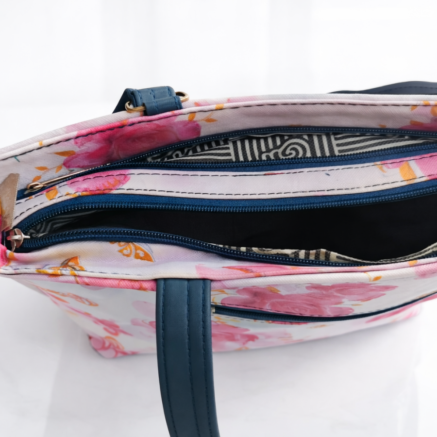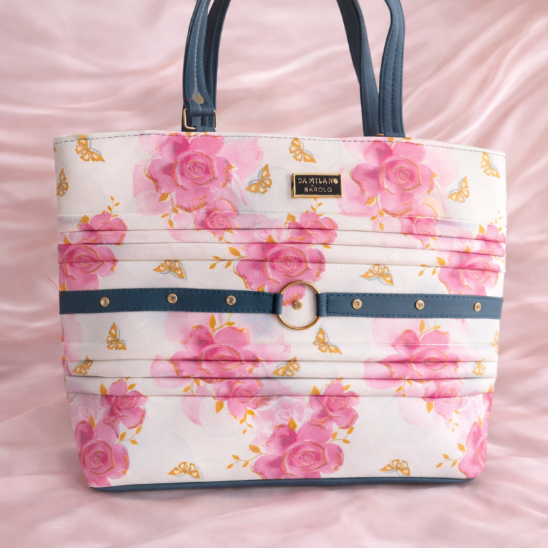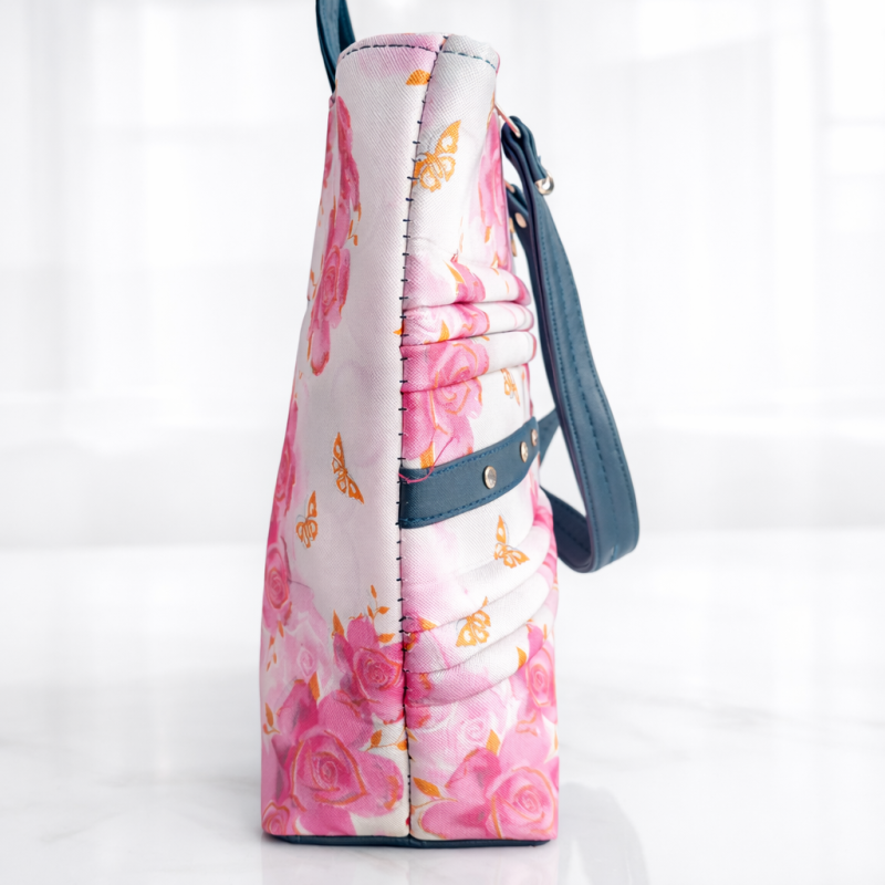 Stylish floral print tote handbag featuring pink rose design, pleated detailing and blue handle accents. Spacious, lightweight and perfect for office, shopping and daily use.