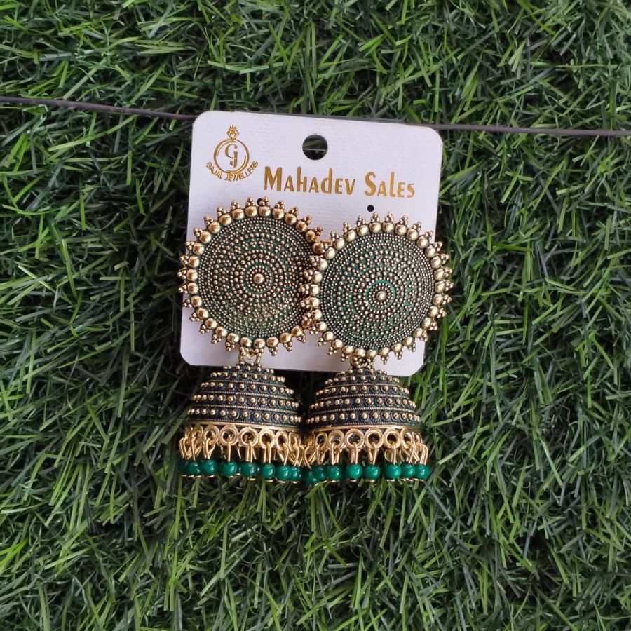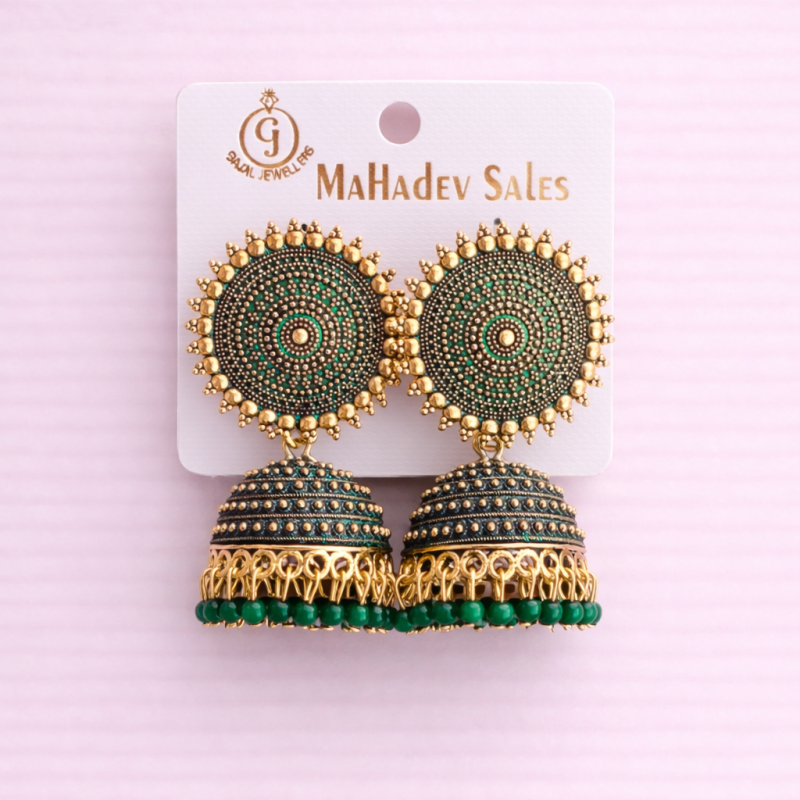 Antique gold-plated traditional jhumka earrings featuring detailed green circular stud design and matching green bead drops, perfect for festive and wedding wear.
