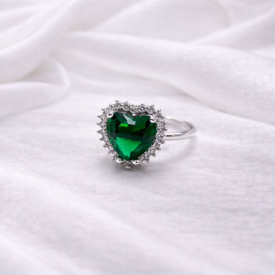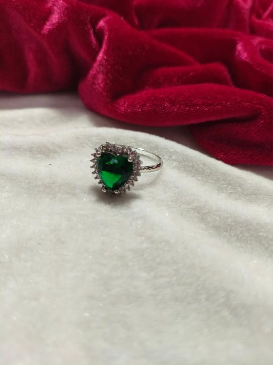 Elegant silver plated ring featuring a heart-shaped emerald green crystal surrounded by sparkling halo stones. Perfect for parties, gifting, and special occasions.