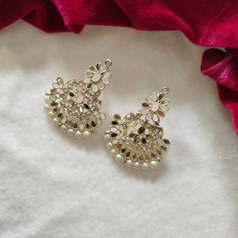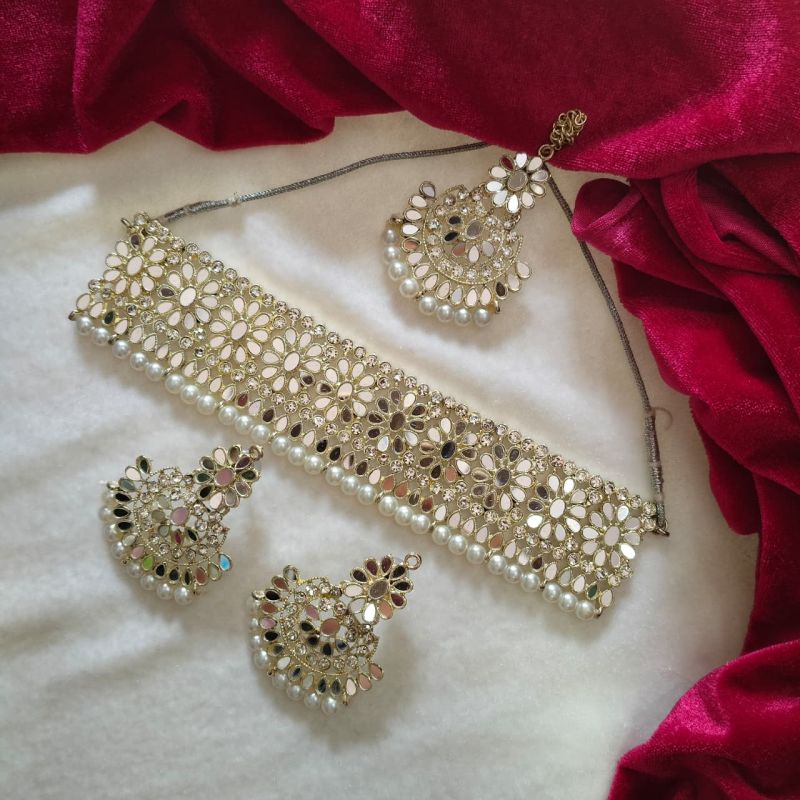 A gorgeous floral mirror-work choker set with pearl detailing, paired with matching statement earrings, perfect for weddings and party wear.