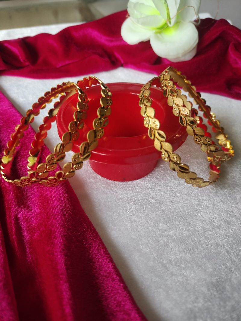 Elegant gold finish leaf-pattern designer metal kada bangles, perfect for weddings, festive wear, and party styling.