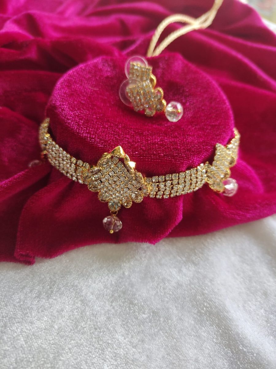 Beautiful gold plated American diamond choker necklace with matching crystal drop earrings, perfect for weddings, parties, and festive occasions.