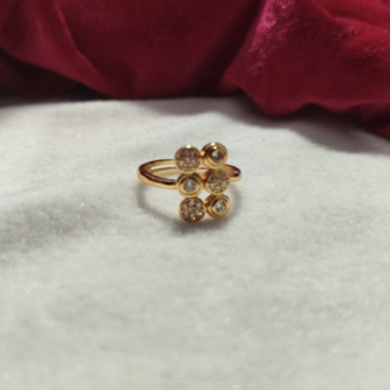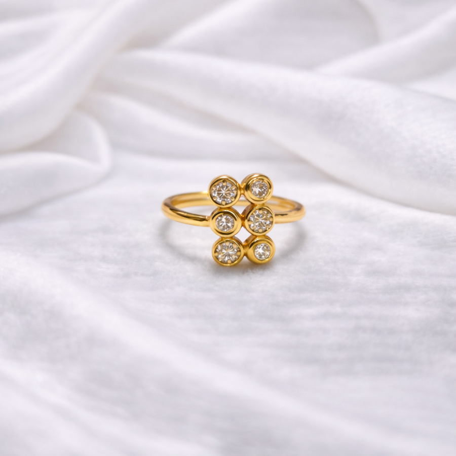 Elegant gold plated ring featuring a six-stone crystal cluster design in a floral pattern. Perfect for daily wear, parties, and special occasions.