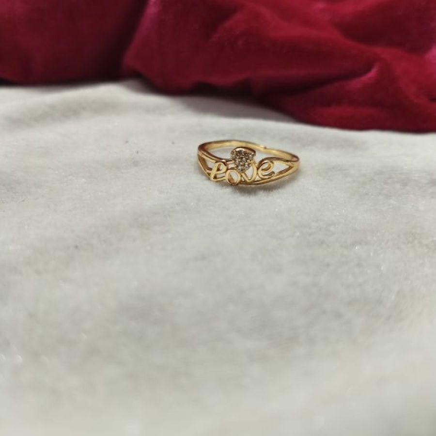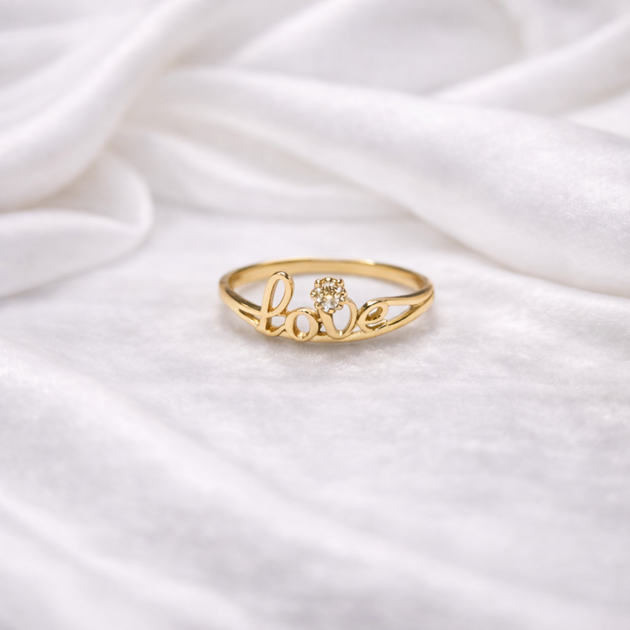 Stylish gold tone ring featuring a delicate “Love” script design with a sparkling crystal accent. Perfect for daily wear and romantic gifting.
