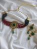 Beautiful green kundan choker necklace set with red-green bead strands and matching drop earrings, perfect for weddings and festive occasions.