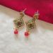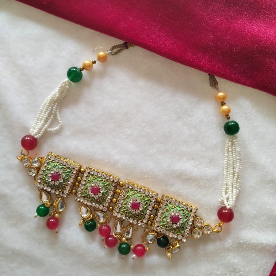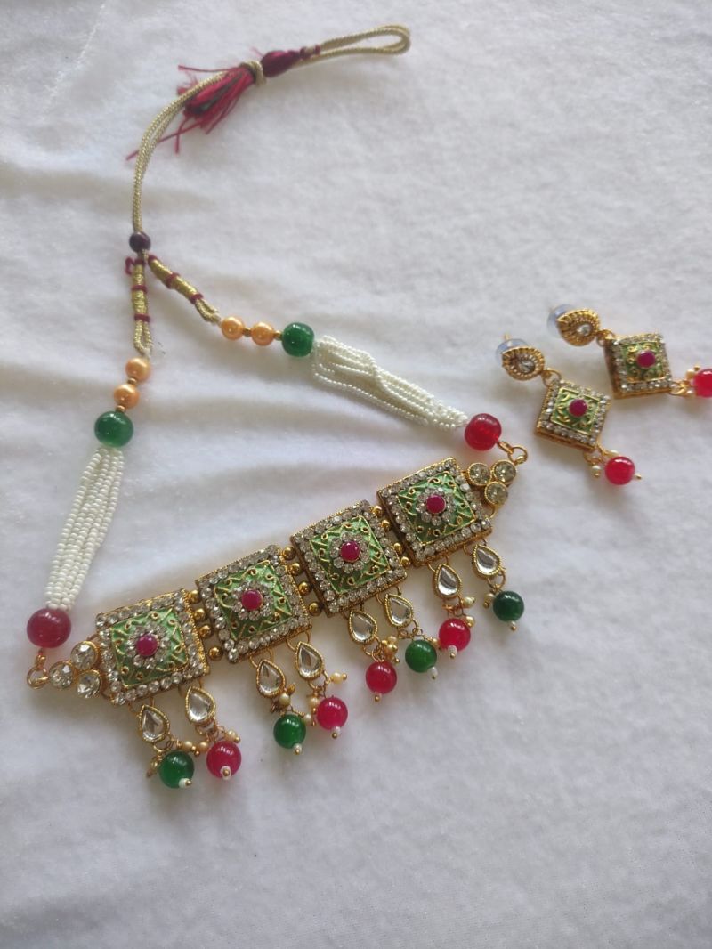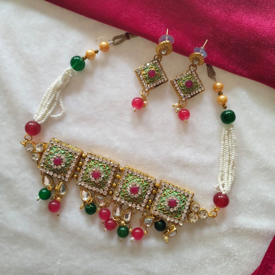 Beautiful meenakari kundan choker necklace set featuring green square motifs with red-green bead drops and matching earrings, perfect for festive and traditional wear.