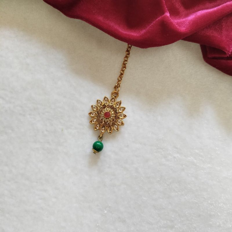 Elegant green and red multi-strand beaded necklace set with gold-tone floral motifs, matching earrings and maang tikka, perfect for traditional and festive wear.