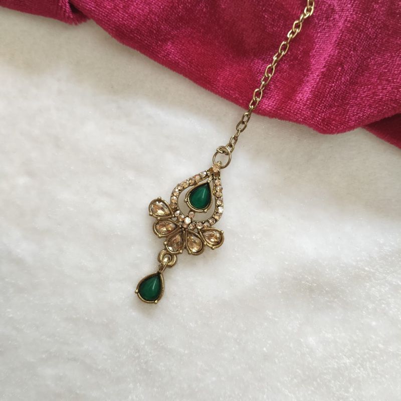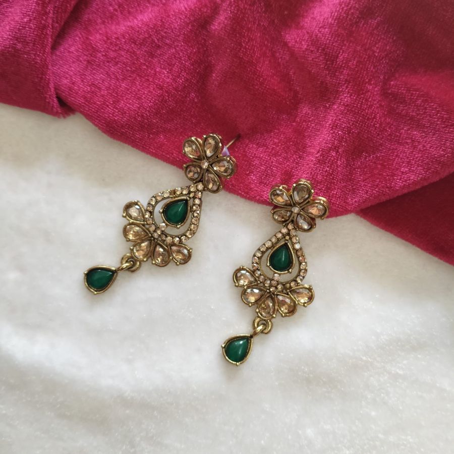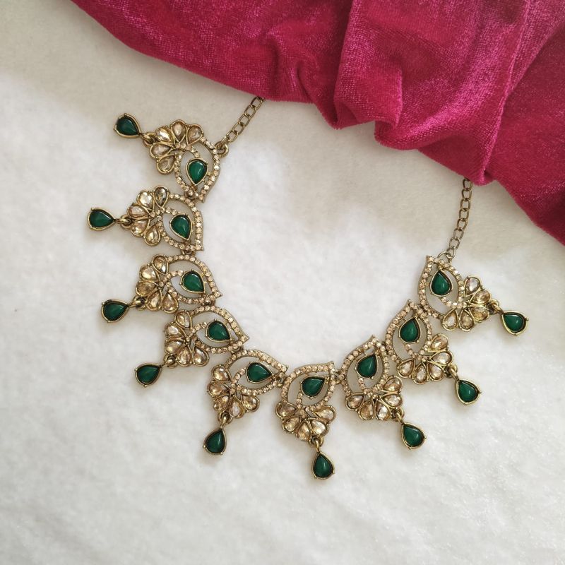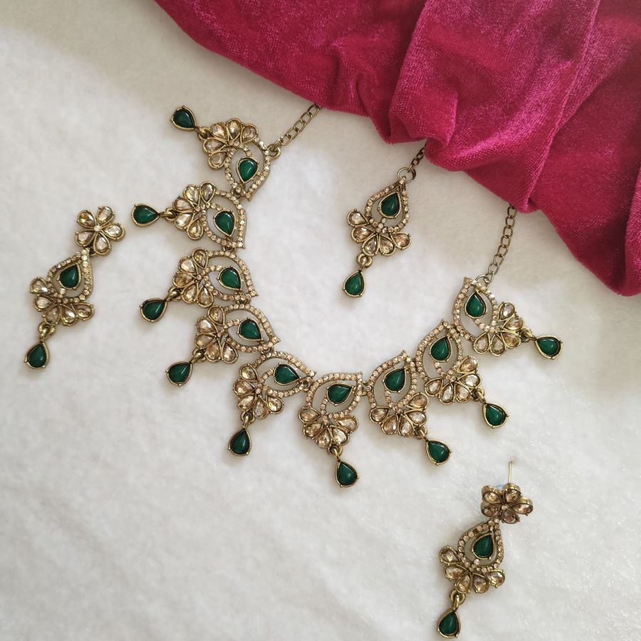 A graceful green stone kundan-style necklace set featuring gold-tone finish and elegant teardrop accents, perfect for festive and wedding wear.