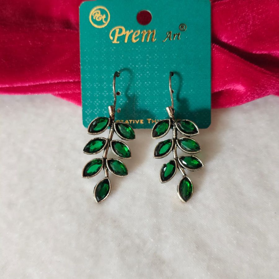 Stylish oxidised leaf drop earrings featuring emerald green stones, perfect for everyday and ethnic looks.