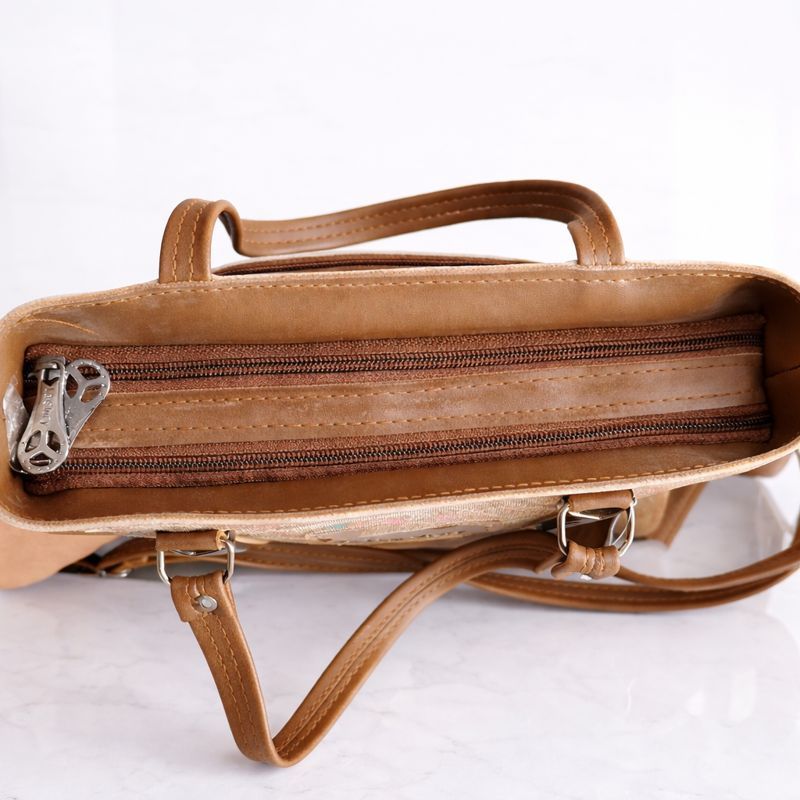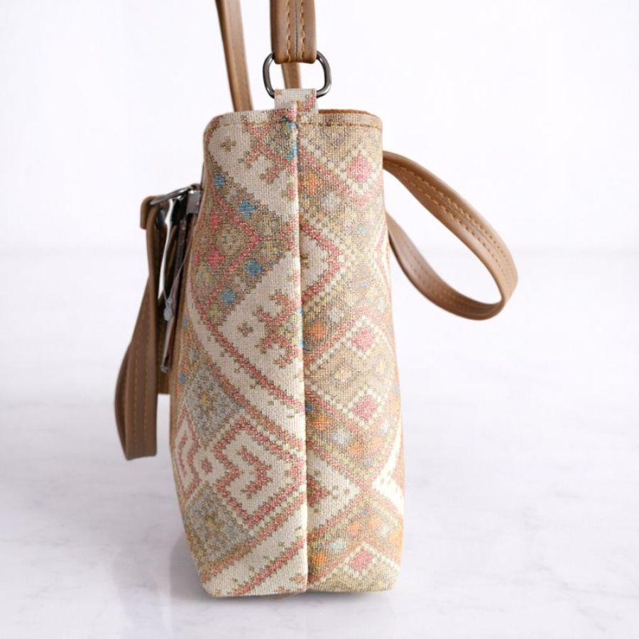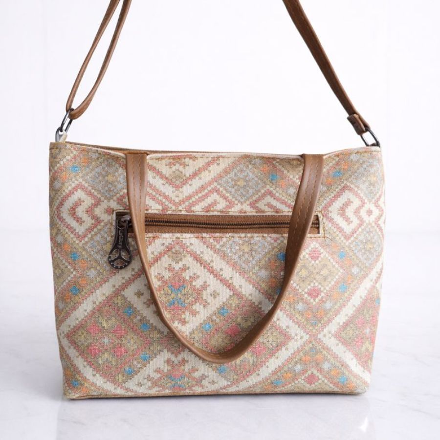 A stylish La Glory ethnic printed shoulder bag with a multicolor geometric design and brown handles, perfect for daily use, office, and casual outings.