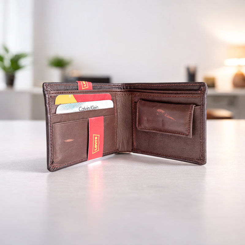 Premium quality brown leather bi-fold wallet by Levi’s, designed for everyday use. Stylish, compact and durable, this wallet offers multiple card slots and a sleek finish, making it perfect for modern men.
