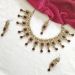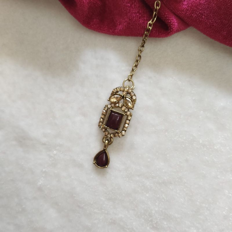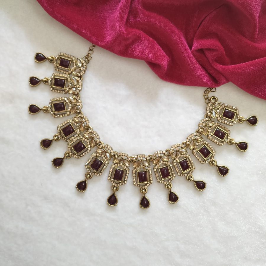 An elegant maroon stone kundan-style necklace set with gold-tone finish and delicate drop detailing, perfect for weddings and festive occasions.