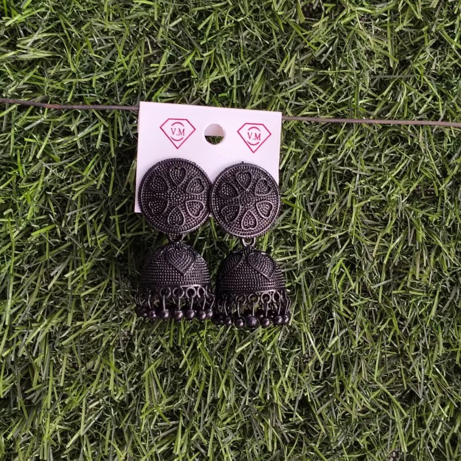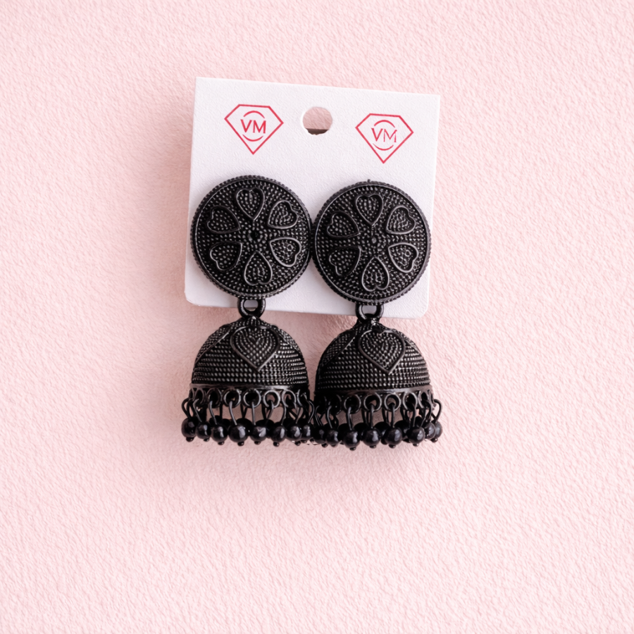 Elegant matte black oxidised jhumka earrings featuring heart motifs and black bead drops, perfect for ethnic and casual wear.
