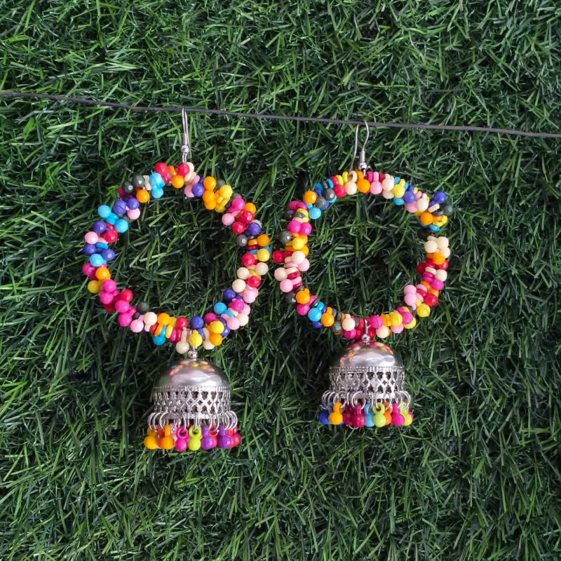 Trendy multicolor beaded hoop jhumka earrings with silver dome and vibrant hanging beads, perfect for casual, festive and boho looks.