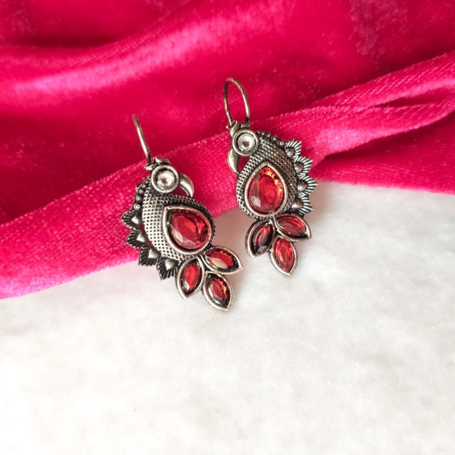 Stylish oxidised earrings featuring a peacock-inspired leaf design highlighted with deep red stones for a bold ethnic look.