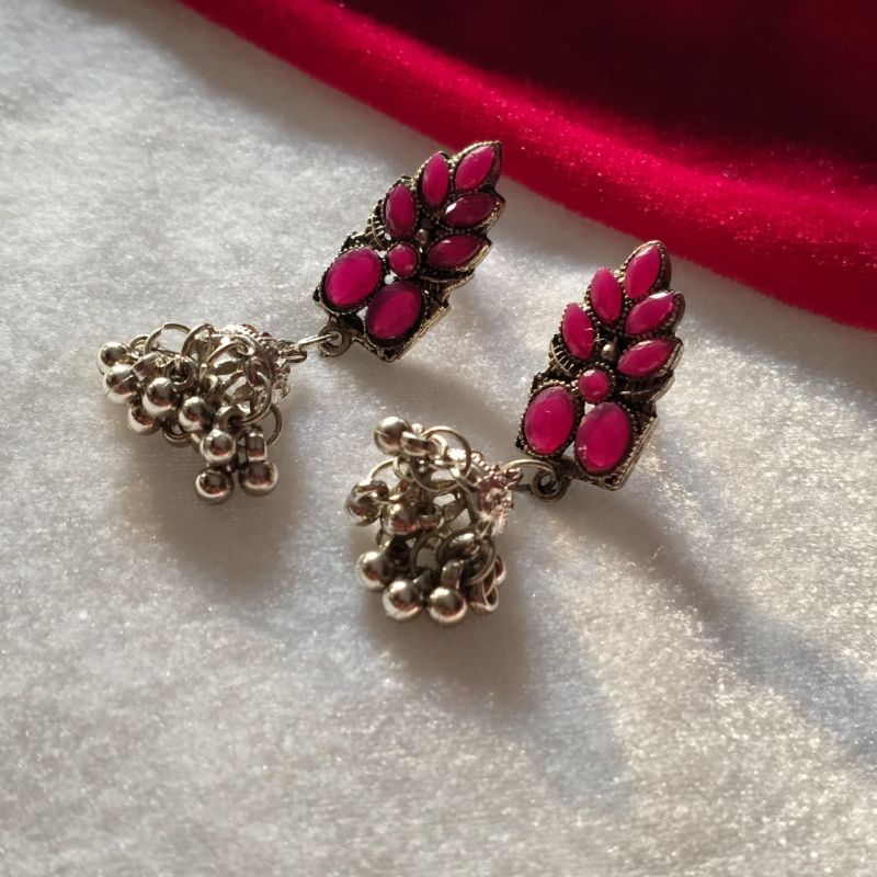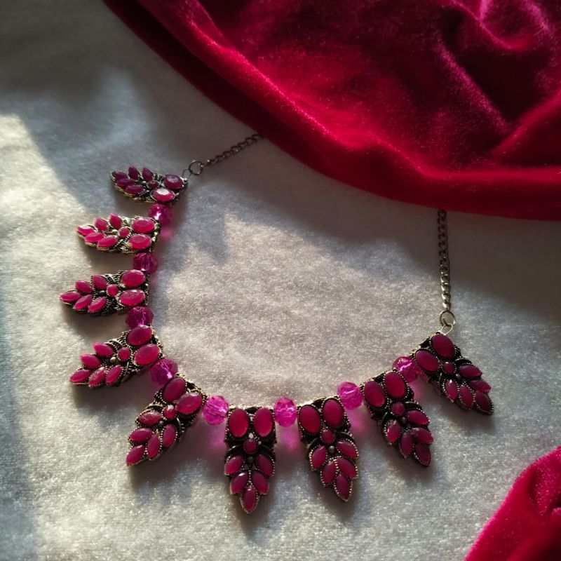 This beautiful oxidised choker set features vibrant pink stones in a stylish leaf motif design with matching earrings. Perfect for party wear, festive outfits, and trendy traditional looks.