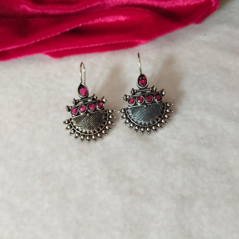 Stylish oxidised earrings featuring pink stones with a tribal-inspired design, perfect for ethnic and festive outfits.