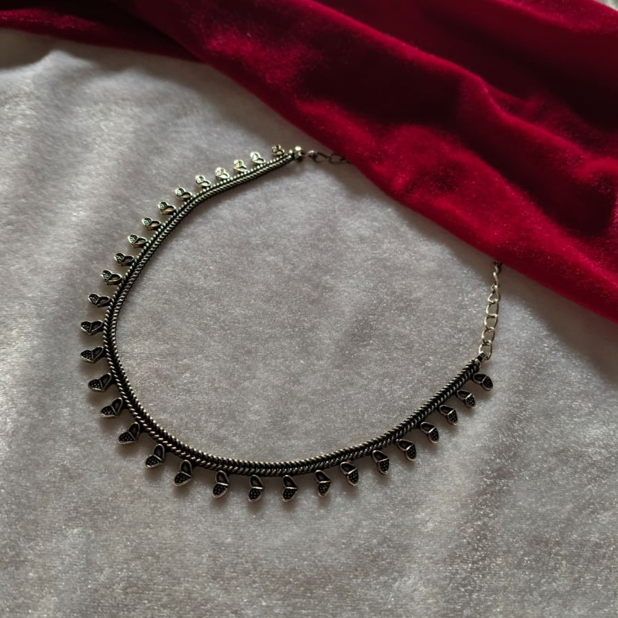 This stylish oxidised silver choker necklace features cute heart-shaped charm detailing with a matching pair of traditional jhumka earrings. Perfect for daily wear, festive looks, and Indo-western outfits.