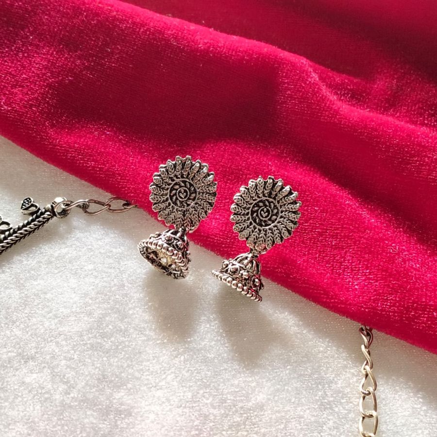 Oxidised Silver Heart Charm Choker Necklace Set with Jhumka Earrings