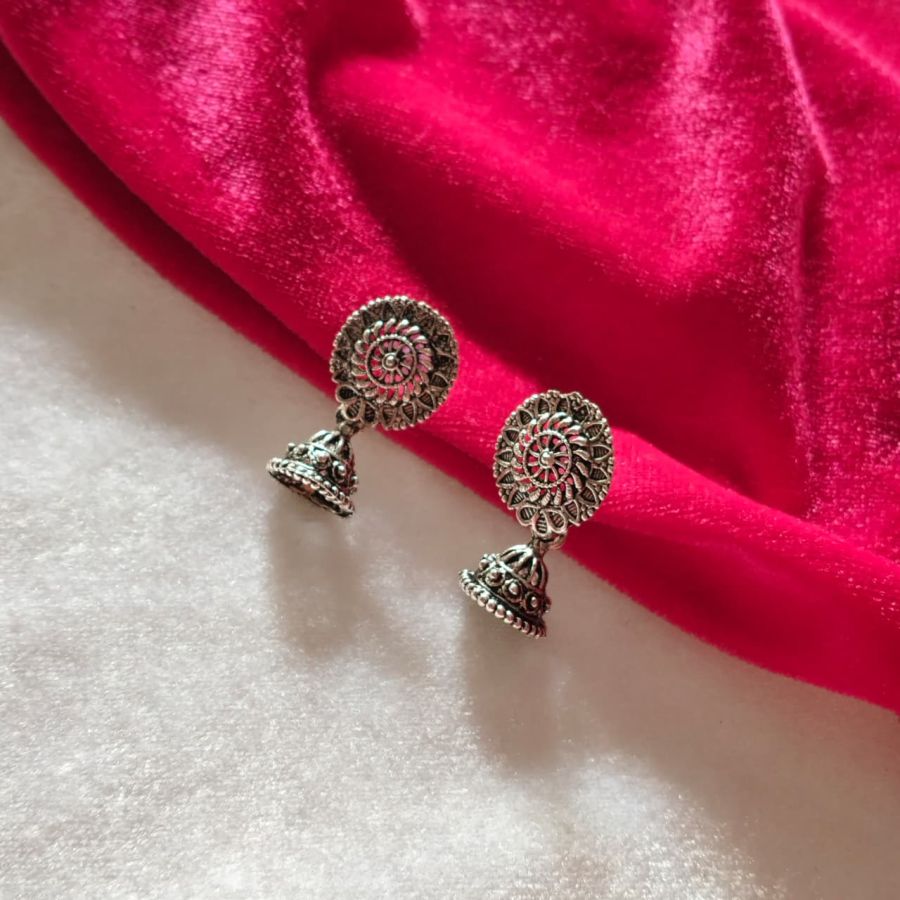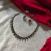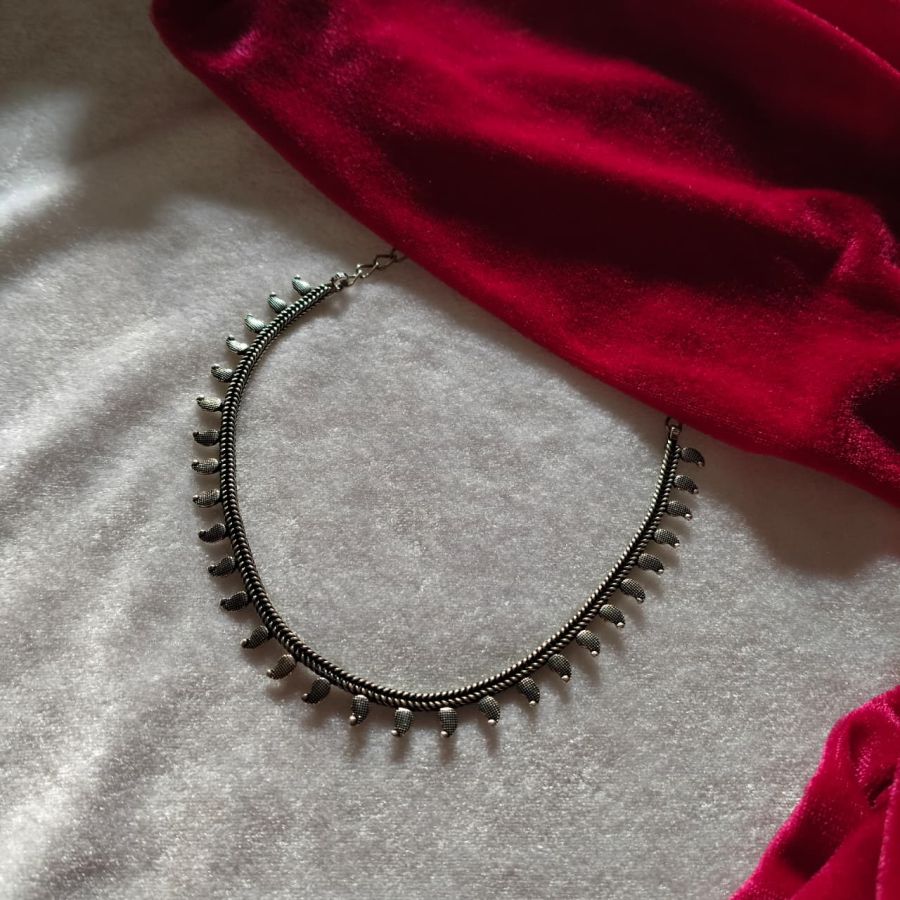 This elegant oxidised silver choker set features a unique mehandi-inspired design with matching jhumka earrings. Perfect for festive wear, traditional outfits, and party styling.